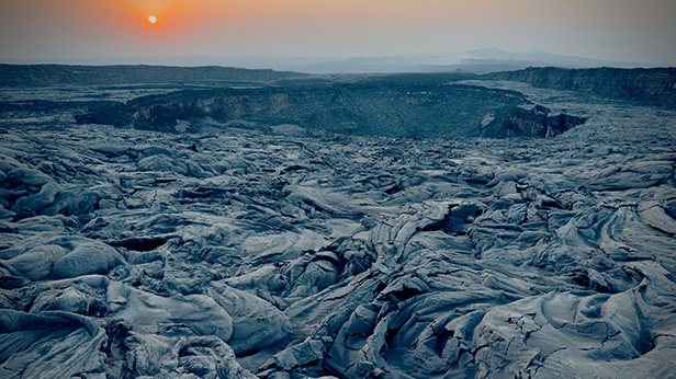 ダナキル砂漠には30以上もの火山があります。スミソニアン協会によってあげられている、アフリカの火山の内、約4分の1がこのエチオピア北部とエリトリアに存在しています。その中でも観光客の訪問が許可されているのがこのエルタ・アレ火山です。粘性の低い溶岩によって形成された楯状火山で、標高は613mあります。エルタ・アレ火山は活きている火山ならではの大きな変化を何度も見せています。2010年、2016年そして2017年には大規模な火山活動により、溶岩が流れ出し、安全上の理由から火口近くまで行くことができなかった事もありました。2025年には、同じ山脈の南端に属するハイリ・ゲッビ火山が1万2千年ぶりに噴火し、エルタ・アレ火山頂上のクレーター内部にも溶岩台地の一部が崩落するなどの大きな影響がありました。西遊旅行のツアーでは山頂クレーターにほど近い中腹部分まで四輪駆動者で登り、山頂までは片道45分ほどガレ場を歩いて登ります。到着日の夜と翌朝の2回に渡ってクレーターへと降りて溶岩台地を歩きます。溶岩台地の上を実際に歩くと、地下深くで蠢いている溶岩による地熱の暖かさや、時折り台地の胎動を感じることが出来ます。日の出の時間帯には、溶岩が固まってできた、自然によって造られた芸術作品とさえ言える造形美と朝日の絶景をお楽しみいただく事ができます。