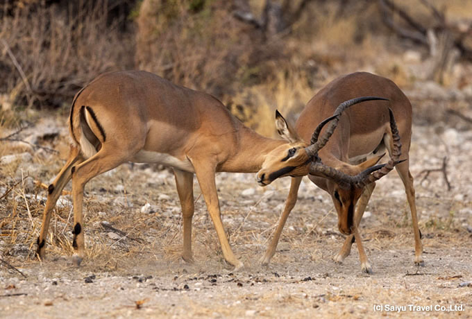 朝発 専用車にてナミビア中央部のホバテレ保護区へ。ここには希少動物のツチブタも生息しています。着後、ホバテレ保護区での午後のサファリへ。ナミビア北西部やアンゴラ周辺でしか見られないカオグロインパラや、ライオン、ヤマシマウマ、オリックス、アンゴラキリンなどの哺乳類や、クロワシミミズク、ニシメンフクロウ、ダマラアカハシコサイチョウなどたくさんの野鳥の観察が期待できます。日没後も夜行性の動物との出会いを期待してナイトサファリへ出かけます。
