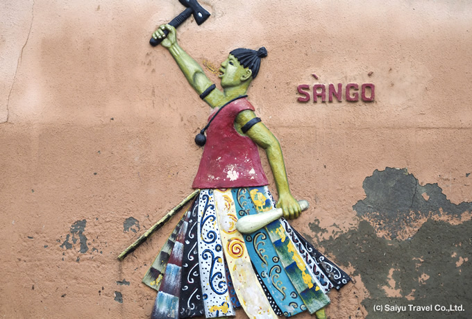 南西部の平原には昔からヨルバ人が暮らし、数千年にわたって農業を営んできました。彼らは様々な物事に結び付いた400柱以上のオリシャ(神)を信仰しています。オショボの郊外にある聖なる森には愛と豊穣を司る女神オシュンが住むといわれ、古代と現代の両方の様式で作られた神殿や祠があります。ナイジェリア各地の都市化が進む中、伝統的な「聖なる森」は放置され、破壊の危機にありました。1950年代に、オーストリア人芸術家シュザンヌ・ヴェンガー(ヨルバ名:アドゥンニ・オロリシャ)がこの地に移住。彼女は現地の彫刻家たちと共に、女神の森に巨大な彫刻や神殿を再建し、伝統信仰と現代芸術を融合させました。この努力が実り、「オシュン=オショボ聖なる森」は2005年に世界遺産に登録されました。現在のオショボの街はたくさんのアートギャラリーが並び、歴史的な「聖なる森」と活気ある現代アートが共存する、ヨルバ文化の精神的な故郷と見なされています。ツアーでは世界遺産の森を訪れ、古来から続くヨルバ人の精神世界を垣間見ます。