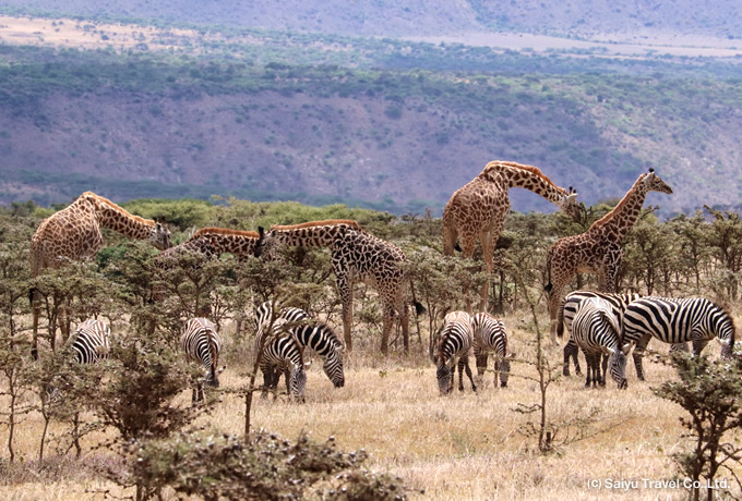 マサイキリンとシマウマの群れ(ンゴロンゴロ自然保護区)