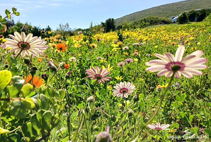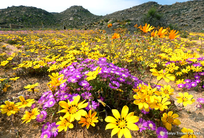 専用バスにてナマクワランドのスプリングボックへ。着後、ナマクワ国立公園のスキルパッド保護区を訪れ、フラワーウォッチングをお楽しみいただきます。一年のうちに限られたごくわずかな期間だけに、一面の花畑が出現します。