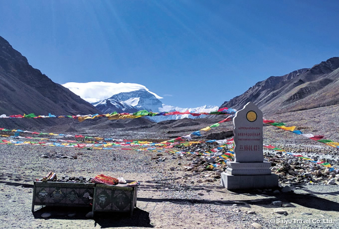 チベット語でチョモランマ、英語でエベレスト、ネパール語ではサガルマータと呼ばれる世界最高峰。チベット側からは手前に遮る山がないため、迫力の山容をご覧いただけます。