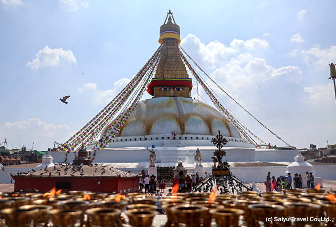 ご希望の方は、オプショナルでエベレスト遊覧飛行をお楽しみください。午後、カトマンズ市内観光(カトマンズ盆地を見下ろす丘に建つスワヤンブナートボダナート、旧王宮跡ダルバール広場クマリの館シヴァ寺院等)。その後、航空機にて広州へ。
