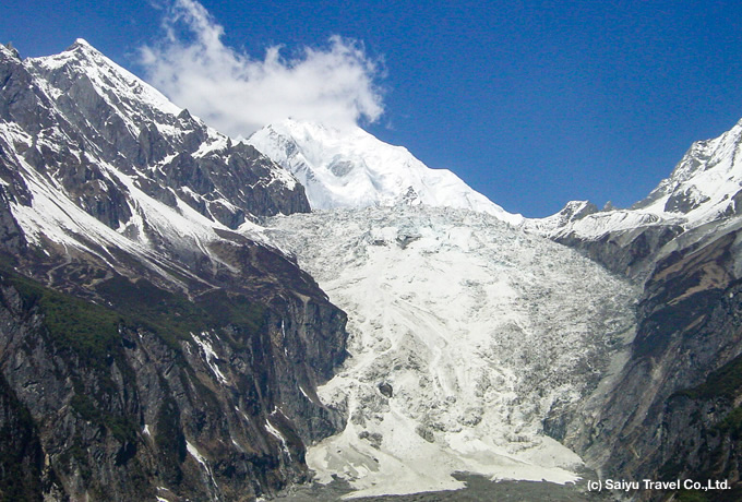 専用バスにて、海螺溝観光の拠点となる磨西鎮へ。午後、シャトルバスにてミニヤコンカ山麓の三号営地へ。その後、大渓谷に架けられたロープウェイを利用し、四号営地へ。ミニヤコンカ(7,556m)と海螺溝の氷河を展望します。 磨西鎮(1,580m)泊