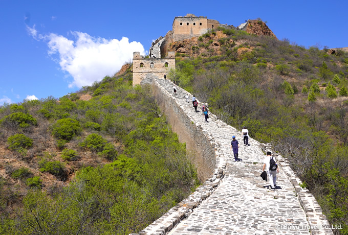 専用車にて、多種多様な望楼が連なる様相が美しい金山嶺長城の正門へ。堅牢な要塞将軍楼や、急峻な階段を上り東五眼楼まで歩きます(約5時間)。