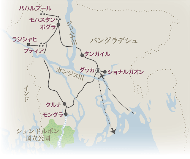 空路、東京・大阪よりそれぞれアジア内都市へ。着後、航空機を乗り換えて、首都ダッカへ。着後、ホテルへ。 。 ダッカ泊