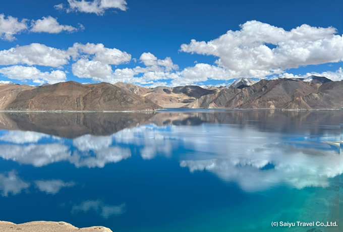 専用車にて、天空の湖パンゴン・ツォ(湖:約4,250m)へ。真っ青に輝く湖面と後ろにそびえるヒマラヤの絶景をお楽しみください。