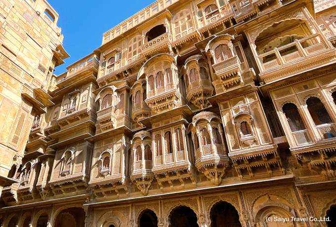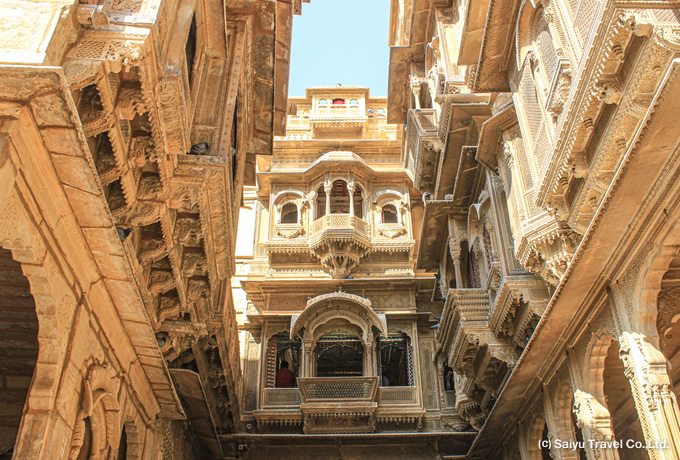 1156年にバッティ家の王ジャイサルによって創設され、インドと中央アジアを結ぶラクダ隊商の交易路の中継地として、最盛期には11万人の人口を擁するほど繁栄した都市国家でした。街には莫大な富がもたらされ、商人や貴族たちは競って、豪華な装飾彫刻を施した立派な邸宅を建てました。 かつての東西交路のオアシスは衰退してしまいましたが、今もなお優雅なハヴェーリーなど中世の家並みを残しており、多くの人を惹きつけています。