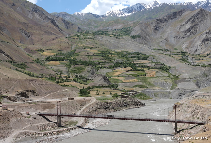 四輪駆動車にて、パンジ川沿いを走り、ゴルノバダフシャン自治州の州都ホルグ(2,070m)へ。パンジ川の対岸に、アフガニスタンの村々を眺めることができます。