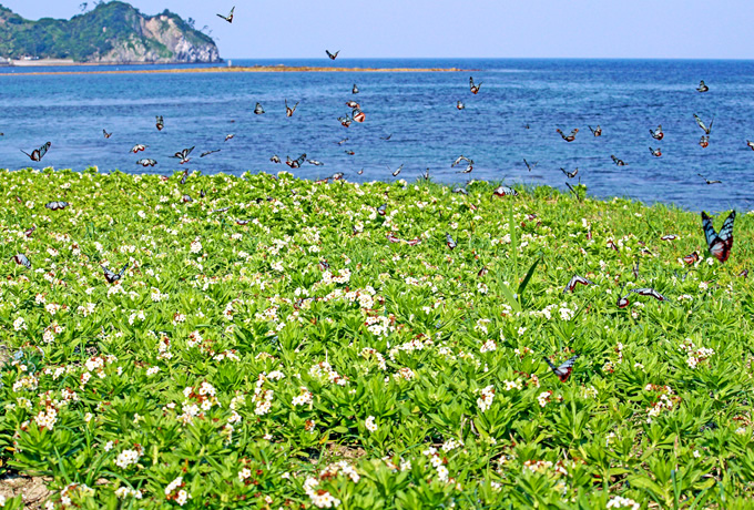 姫島は、アサギマダラの休息地として有名です。初夏と秋の渡りの時期には、たくさんのアサギマダラが姫島に翅を休めに飛来します。 5月上旬から6月上旬にかけては海岸に咲く白い可憐な花・スナビキソウの蜜を求めて飛来し、その後、北の地へ向かって飛び立ちます。10月中旬頃には、北の地で世代を交代した蝶がフジバカマの蜜を求めて飛来し、暖かい南の地へと移動していきます。