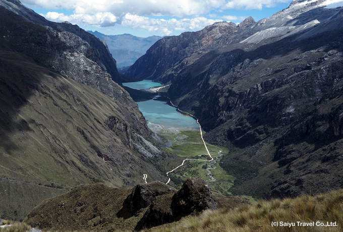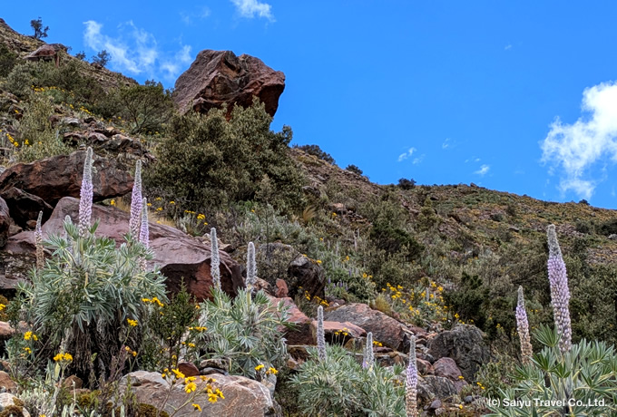 ヤンガヌコ渓谷(標高3,800~4,000m)に入り、ブランカ山群のワンドイ峰やピスコ峰などに囲まれたなどの山々や2つの湖オルコンコチャ湖チナンコチャ湖)の展望を楽しみます。また、渓谷などを散策しながら、ブランカ山群に咲くペルー固有種であるオキ・マカ(リンドウ科)やアウリンシャ(ユリズイセン科)の花々や薄い樹皮が重なり合う樹木ケニュアル(ポリレピス属)などの観察も楽しみます。