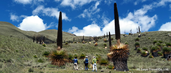 プヤ・ライモンディは「100年に一度だけ花が咲く」と言われ、アンデスの高山帯に生息する世界最大のパイナップル科の植物です。最大で高さ15mにまで育ち、どの株も6,000~10,000の花と600万~1,200万の種子をつけ、巨大な花序は世界的に見ても独特です。プヤ・ライモンディは一回結実性で、生物的周期は約40年~100年と長く、長い年月を過ごした後に全長10m前後の巨大な花序を突き出し開花し、開花した後は枯死してしまいます。そのため、なかなか花をつける個体を観察することは難しいですが、プヤ・ライモンディが群生する谷を訪れ、プヤ・ライモンディがどのような生態なのか、ブランカ山群の山麓にそそり立つプヤ・ライモンディを1つ1つ間近で観察すると、その興味は尽きることがありません。独特の生態であるプヤ・ライモンディを観察するため、是非ブランカ山群へご一緒しませんか。もしかしたら、幻の花にも・・・。