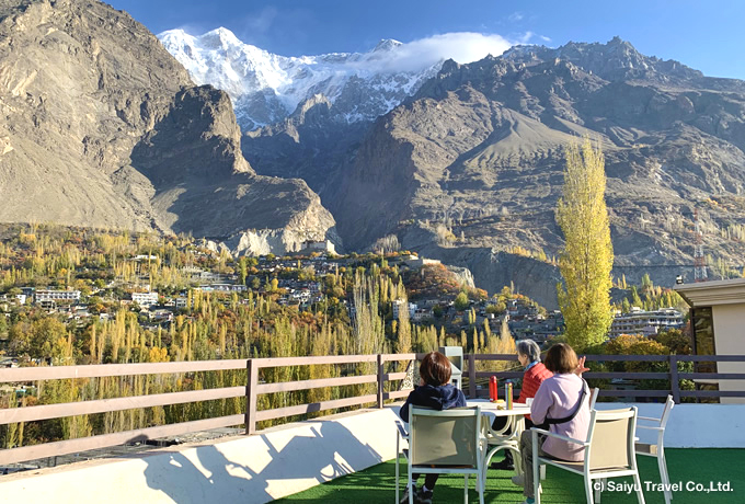 ホテルのバルコニーからは雪を頂き輝く名峰と、秋の黄金色に染まる谷の展望をお楽しみください。バルチット城見学や黄葉が美しいポプラの木々を眺めながらの水路沿いのお散歩、バザールでお買い物などのんびりとお過ごしいただけます。