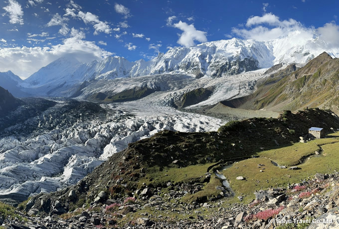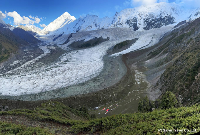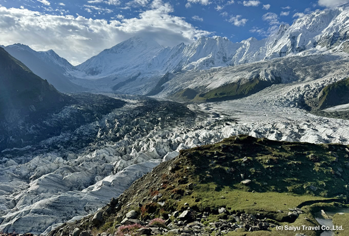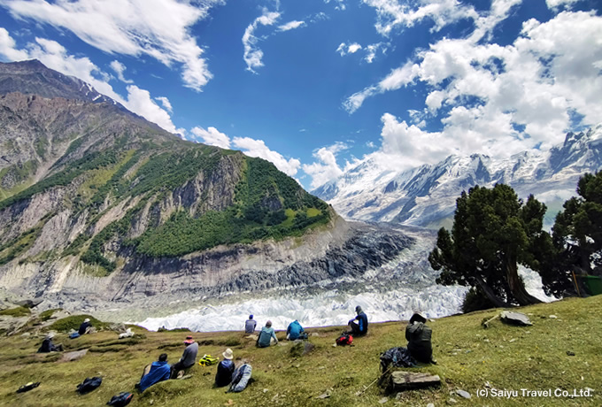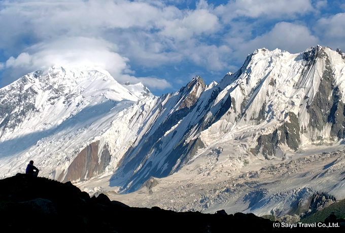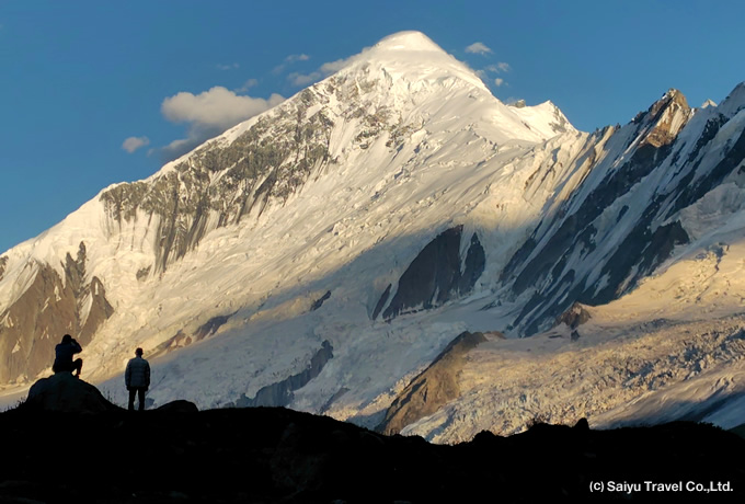 7,000m峰が聳え立つラカポシB.C.からは、往復ハイキングでミナピン氷河へ大接近。氷河の奥にそびえるディラン(7,257m)やラカポシ(7,788m)にさらに迫り、高峰群とそこから流れ落ちる氷河を一望するの絶景の展望地で、ゆっくりと撮影をお楽しみいただけます。