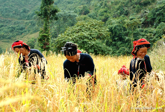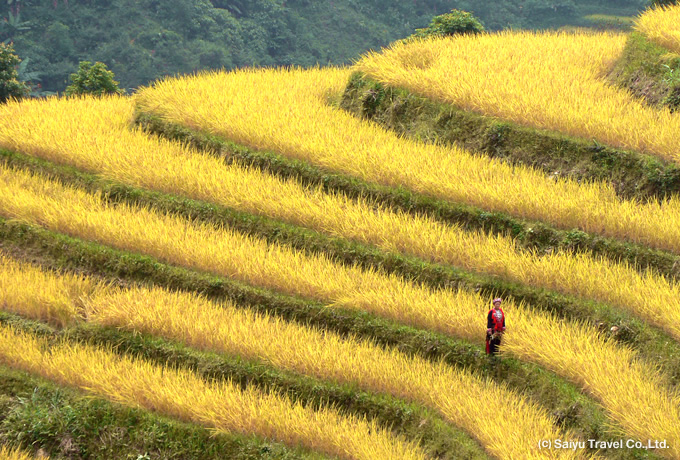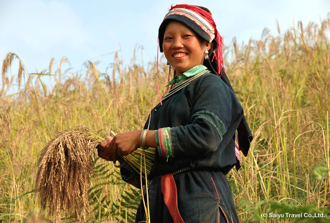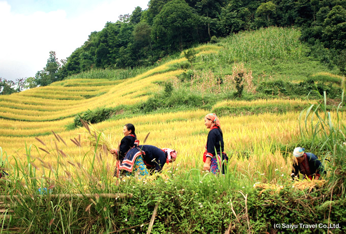 刈り入れに精を出す少数民族の姿と、一面に輝く稲穂の風景はこの時期ならではのもの。色鮮やかな民族衣装と黄金が織りなす色彩は息を呑む美しさです。