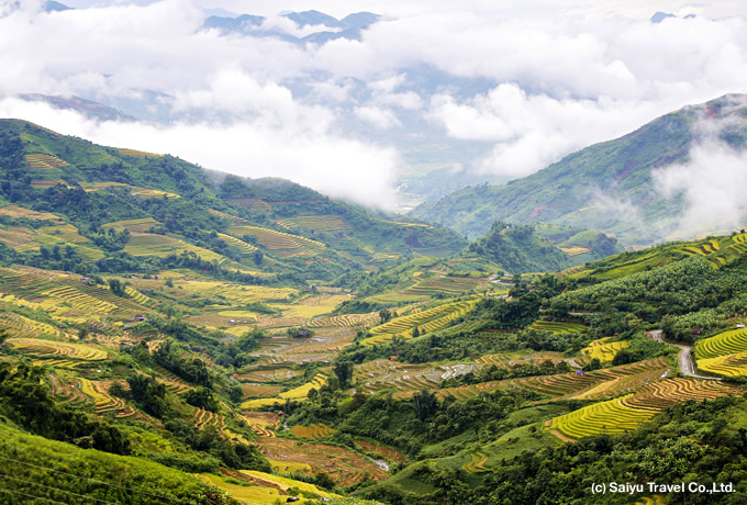 ベトナム北部の山深い地域。あまり観光客の訪れることのないこの地には、今も昔ながらの生活を営む少数民族が暮らしています。彼らは少ない耕地で生活していくため、長い年月をかけて何百段も続く見事な棚田を作り上げてきました。秋は特別な季節。春に田植えをし、精魂を込めて育てた稲が収穫の時期を迎えます。秋にこの地へ赴くと、黄金色の稲穂の中で、赤や黒の民族衣装に身を包んだ人々が農作業をする光景に出会うことができるでしょう。また、道中訪れる定期市には、色鮮やかな刺繍や藍で染められた衣装を纏う様々な少数民族が集います。いつもよりお洒落をした人々で賑わう華やかな市場を訪れ、のんびりと散策をお楽しみください。