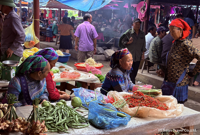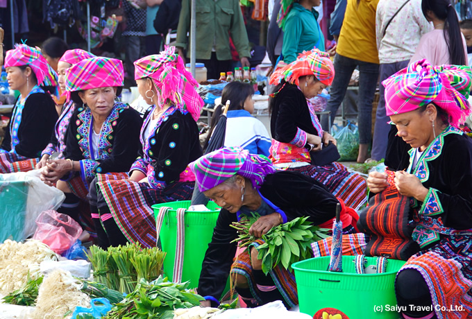 朝、白モン族やアオザイ・ザオ族の人々で賑わうドンバンの日曜市を見学。その後、専用車にてハジャンへ。途中、紺色の長い丈の衣装が特徴のアオザイ・ザオ族の村、メオバックで行われる日曜市を訪問。