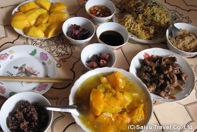 土地柄、豪華なレストランはありませんが、素材を活かした素朴な味わいの品々が人気です。もちもちのおこわ、ほくほくのお芋、採れたて野菜の炒め物やベトナム料理の代表格「フォー」など。どこか懐かしく、日本人の口にもよく合います。現地で育まれた自然の恵みをたっぷりとご賞味ください。