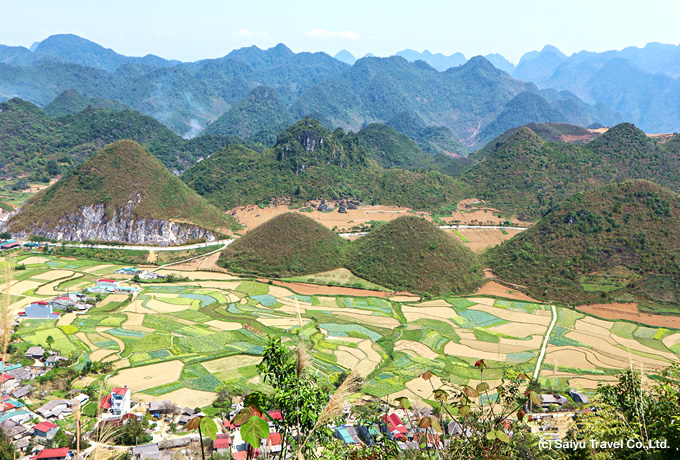 イェンミンの朝市を見学した後、石灰岩の大地や奇岩群の美しい景色の中、ベトナム最北の地ドンバンへ。途中、花ロロ族の村、古い民家の残る白モン族の村、中国との国境近くに暮らす黒ロロ族の村を訪れます。