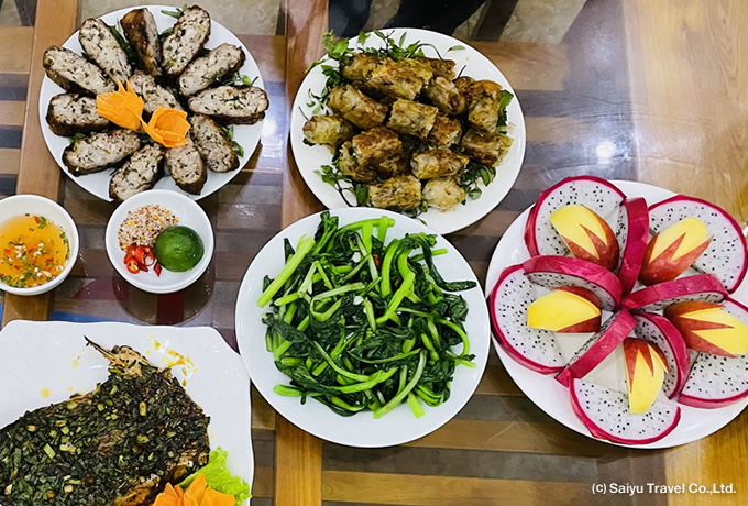 土地柄、豪華なレストランはありませんが、素材を活かした素朴な味わいの品々が人気です。もちもちのおこわ、ほくほくのお芋、採れたて野菜の炒め物やベトナム料理の代表格「フォー」など。どこか懐かしく、日本人の口にもよく合います。現地で育まれた自然の恵みをたっぷりとご賞味ください。