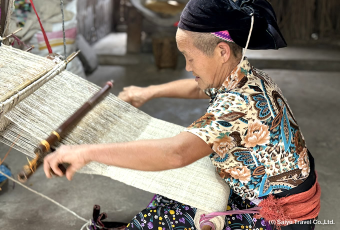 ベトナム北部では特徴のある様々な民族衣装が受け継がれ、女性を中心に普段着として着用されています。ツアーの道中では、刺繍がたくさん施されたスカートや藍染の衣類が干された民家、軒先で刺繍や織物をする女性の光景がよく見られます。女性たちは、日の当たる明るい場所で農作業や家事の合間に手を動かし、緻密で美しい衣装を一つ一つ丁寧に作っていくのです。その手業は母から子へと脈々と受け継がれ、民族の伝統として守られています。