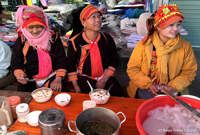 定期市には、色鮮やかな刺繍や藍で染められた衣装を纏う様々な少数民族が集います。いつもよりお洒落をした人々で賑わう華やかな市場を訪れ、のんびりと散策をお楽しみください。