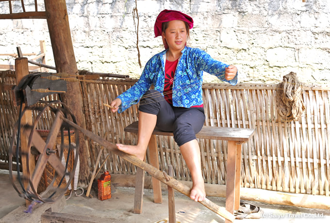 糸をつむぐ白モン族の女性COLUMN ベトナム北部の田舎料理に舌鼓