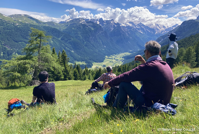 樹林帯の中を登りトルナアルムへ。高山植物の咲く斜面を登り、トルナヨッホ(2,152m)を越え、山上湖のリッヒ湖(2,101m)へ。その後、オーベルンベルク(1,394m)へと下ります。