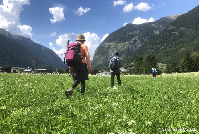 専用車にてエッツタール(渓谷)へ(約1時間)。 ●エッツタール・ハイキング(約4時間) キュータイの湖(1,907m)にて下車し、ハイキング開始。樹林帯からアルペンローゼの咲く山腹やのどかなアルム(牧草地)を歩き、ホッヘッツ(2,020m)へ。 ロープウェイでエッツへと下り、専用車にてウムハウゼンへ(約20分)。 ウムハウゼン:ヨハンナ泊
