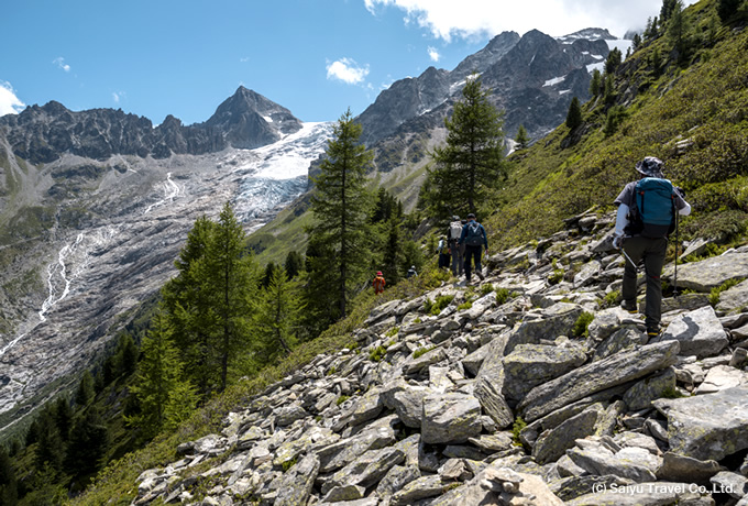 ロープウェーで上部駅へ到着後、トレッキング開始です。 フランス・スイス国境のバルム峠(2,191m)へ。シャモニ谷とモンブラン山群の大展望が広がります。スイス側へと入り、トラバースルートへと入ります。迫力あるトリエン氷河の展望をお楽しみください。シャレード・グラシエの小屋へと一気に下り、水路沿いの林道をフォルクラ峠(1,526m)へ。着後、専用車にてル・シャーブル(850m)へ。