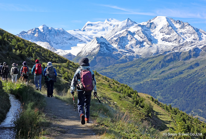 シャモニから見るモンブランの夕焼けや、ツェルマットから見る落差1,000m以上の東壁と北壁の朝焼けには心奪われます。さらにはその道中、グランコンバン(4,314m)やダンブランシュ(4,358m)、ヴァイスホルン(4,505m)やドーム(4,545m)など、峠を越える度に現れる4,000m級の名峰群にも目を見張るでしょう。ヒマラヤとはまた異なるアルプスの山岳歴史と文化を心に刻みながら歩いてみてください。