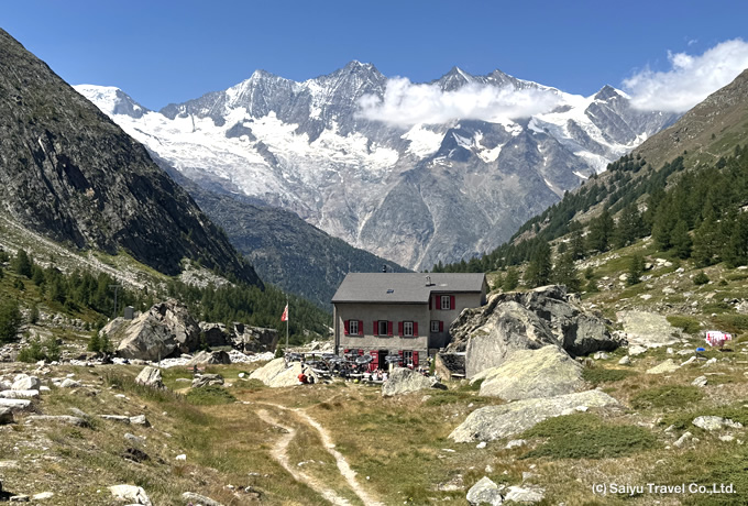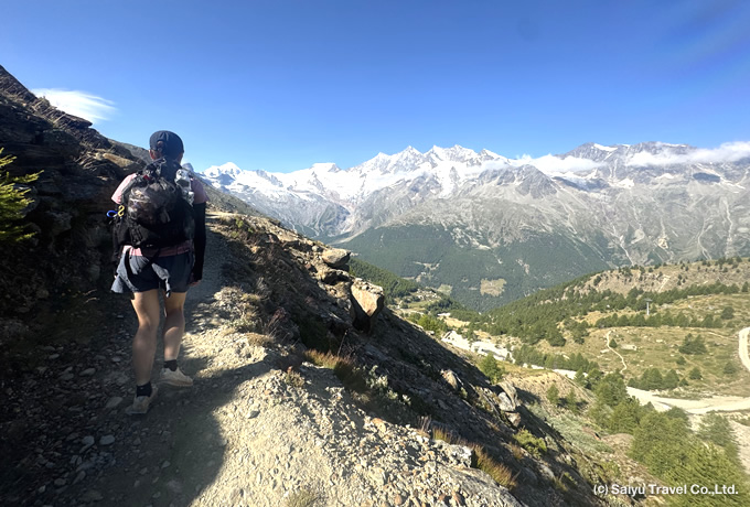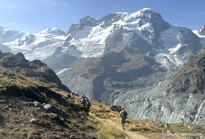 ツール・ド・モンテローザが始まります。朝食後、公共バスでサースグルンド(1560m)へ。着後、ケーブルカーにてクルスボーデン(2,400m)へ。右手にアルプス第3位の高峰ドーム(4,545m)を盟主とするミシャベル山群に囲まれたサースフェーの村を見ながら歩きます。序盤こそ登りですが、トレッキング初日に相応しい緩やかなルートをサースアルマゲル(1,660m)へ戻ります。