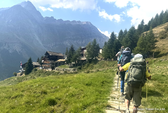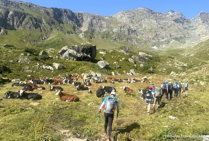 専用車にてクアラザへ。峠まで展望を楽しみながら約1500m弱の標高差の急登を登りつめます。古くから交易で利用されていたトゥールロ峠(2,738m)を越え、セシア谷のアラーニャまで下った後、登り返して山小屋(1,575m)へ。
