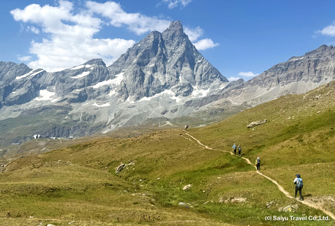 山小屋から歩き出し1時間弱で、標高差約1400mの登り返しに入ります。下ってマッターホルン南壁を望む町、チェルビニア(2,050m)へ。ホテルはプラン・メゾン(2,555m)の好展望地に位置しています。