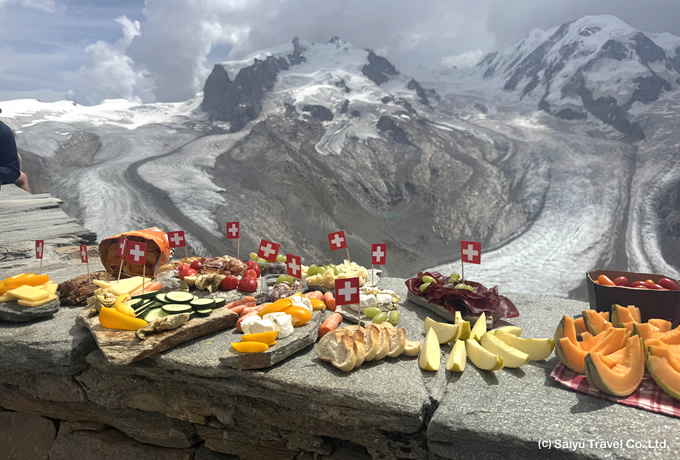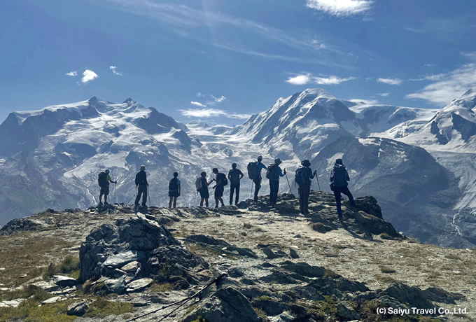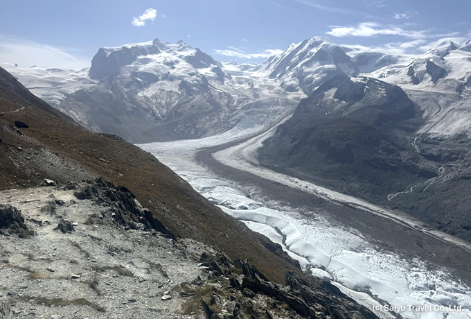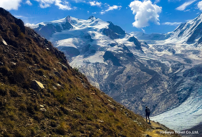 登山電車でリッフェルベルグ(2,582m)へ。着後、ゴルナーグラート(3,089m)を周遊トレッキング。アルプスで3番目の大きさを誇るゴルナー氷河やフィンデルン氷河、スイス最高峰のデュフール峰を抱くモンテローザ(4,634m)から名峰マッターホルン(4,478m)まで、4000m級の山々が29座も広がる迫力の眺望をご満喫ください。