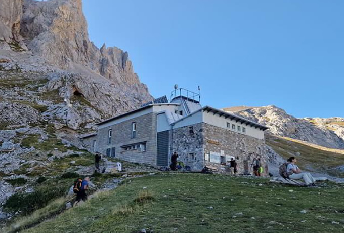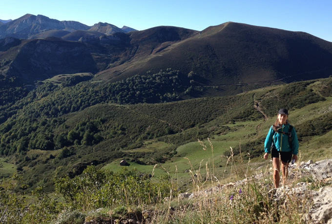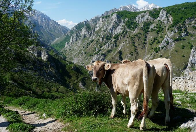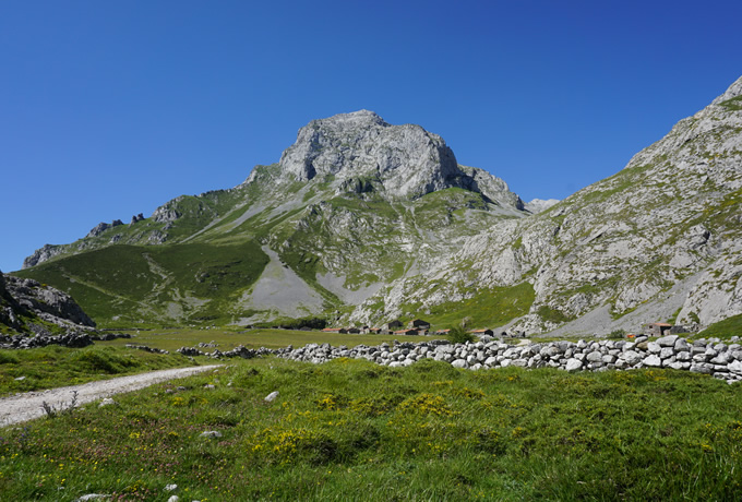 ソトレスから地元の農道をゆっくりと登り、牛小屋を過ぎてパンデバノ峠(1,240m)へ。シャモア(山ヤギ)が生息する細い山道を登り続け、ピコス・デ・エウロパ中央山塊に位置する、クライマーの聖地ピク・ウリエル(別名ナランホ・デ・ブルネス)の山麓にあるベガ・デ・ウリエル小屋を目指します。周辺には、標高差400mを超える石灰岩の山々が間近に迫ります。