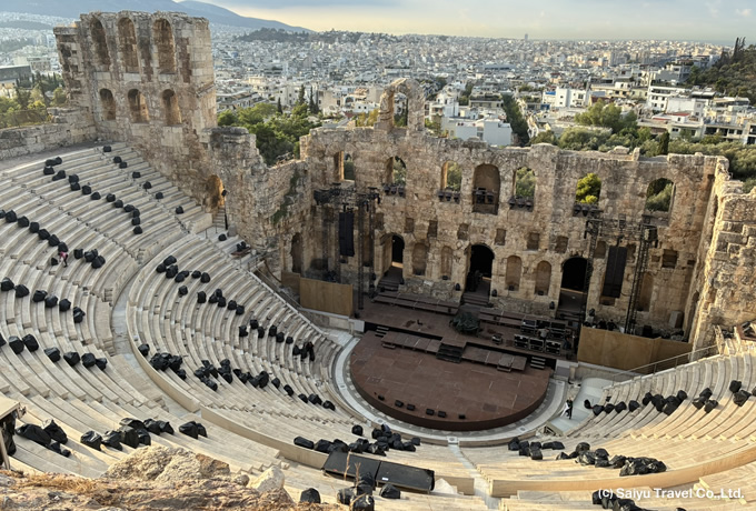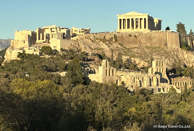 ドバイ着後、航空機を乗り換えて、ギリシャの首都アテネへ。着後、アテネ市内観光へ(約1時間)。フィロパポスの丘(下車)、オリンピック競技場(下車)、ハドリアヌス門(車窓)シンタグマ広場(車窓)などを見学します(約2時間)。