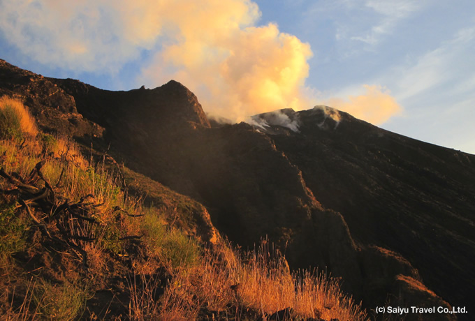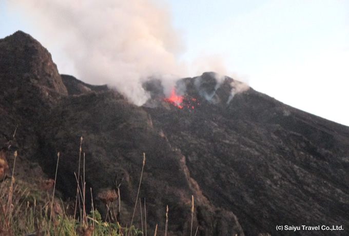火山の中腹を展望所まで歩き、夕暮れの中、見上げる火口付近から迫力ある火山活動の様子を観察します。観察後、下山。