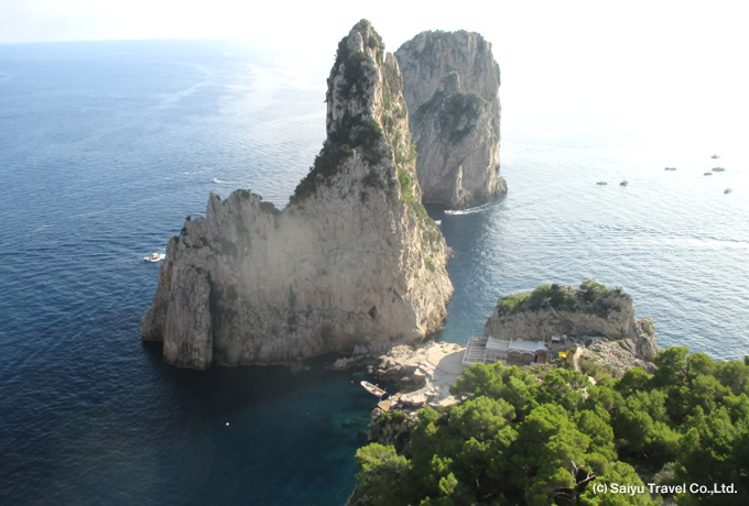 朝、フェリーにてカプリ島へ。小型ボートにて「地中海の宝石」の島一周クルーズをお楽しみください。