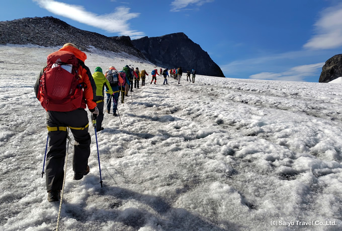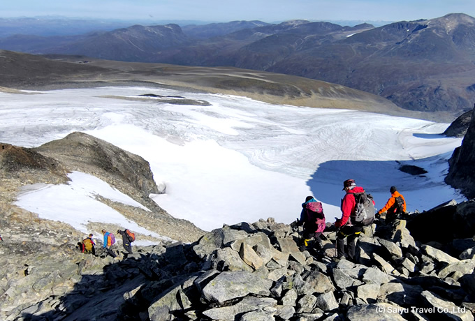 ユッバス小屋から登山開始。ハーネスを着用し登山ガイドとロープを繋ぎ、傾斜の緩やかなストゥッゲ氷河を横断します。その後、短い岩稜を登り、遅くまで残雪のある緩やかな尾根を進み、北欧最高峰ガルフピッゲン(2,469m)の山頂へ。山頂からの雄大な景色を楽しんだ後は、往路をユッバス小屋(1,841m)まで下山します。
