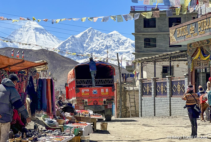 専用車にてヒンドゥー教と仏教の聖地ムクティナート(3,760m)へ。巡礼者で賑わう門前町を散策。急峻なダウラギリの展望が開けます。その後、専用車にてムスタンからチベットへと続く交易路として栄えた村、カグベニへ。密集した民家が要塞のようになった集落を散策します。