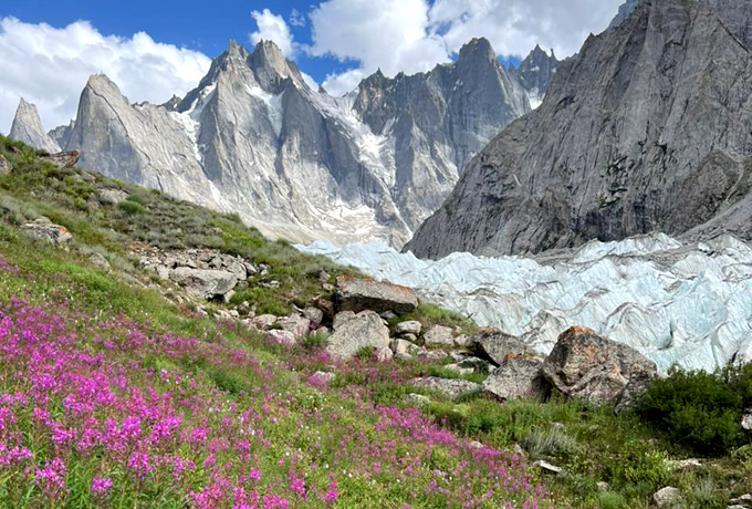 8,000m峰を目指す登山隊やK2の展望を目指すトレッカーで混みあうバルトロ氷河とは異なり、静かなフーシェ谷。夏には高山植物の花が咲く緑豊かで牧歌的な光景に癒されます。フーシェ谷最奥の村フーシェよりK1・マッシャーブルムを眺めながら歩き始め、K6、K7の他、岩峰群の屹立するチャラクサ氷河の谷へと入りK7ベースキャンプを目指します。