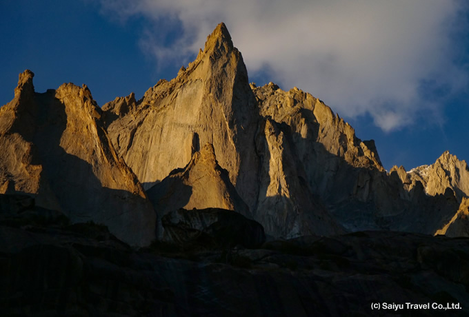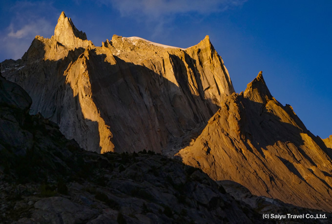 約3時間 | ●トレッキング(約3時間) カラコルムの岩峰がそびえるキャンプ地、ナングマバレー(3,950m)を目指します。マルタクピーク、ゲレートタワー、アマナトピーク、ニサピーク等の岩峰群を望むキャンプ地です。午後、ご希望の方はK6氷河方面への軽いハイキング。キャンプ地から夕陽を浴びる岩峰を望みます。 テント泊