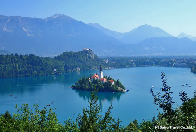 ホテルから湖畔を歩き、マラ・オソイニツァ(685m)の展望地まで往復ハイキング。「アルプスの瞳」ブレッド湖と周囲の山々の展望が広がります。