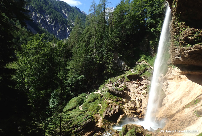 トリグラウ国立公園のヴラタ渓谷へ。ユリアンアルプスの北側に聳えるスロベニア最高峰トリグラウ(2864m)の麓まで歩き、その雄大な北壁を望み、爽快なペリチニクの滝を訪れます。