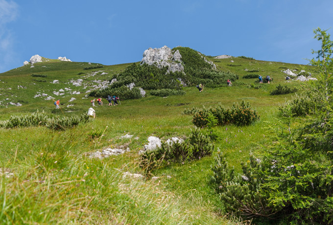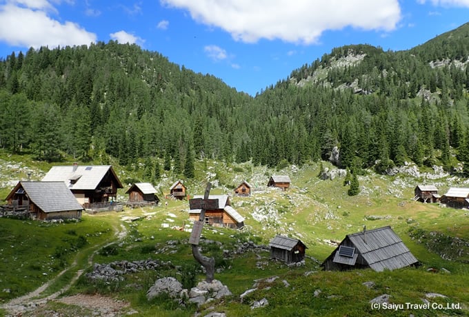 朝、山小屋からはアルプスの山々や谷の景色が私たちを迎えてくれます。周遊コースのフリバリチェ方面に向けてまずは登ります。アイベックスなどの野生動物が生息するエリアです。ザ・コピコ方面へ分岐となる峠(2169m)を越えてさらに2つ目のヴラタ峠(2195m)まで登ると、谷の右側に雄大なティチャリカ山やゼルナリカ山を見上げます。高山植物を愛でながら高度を下げ、放牧地を抜けて登山口のプラニナ・ブラトまで下り、麓に広がるスロベニア最大のボーヒン湖へ。