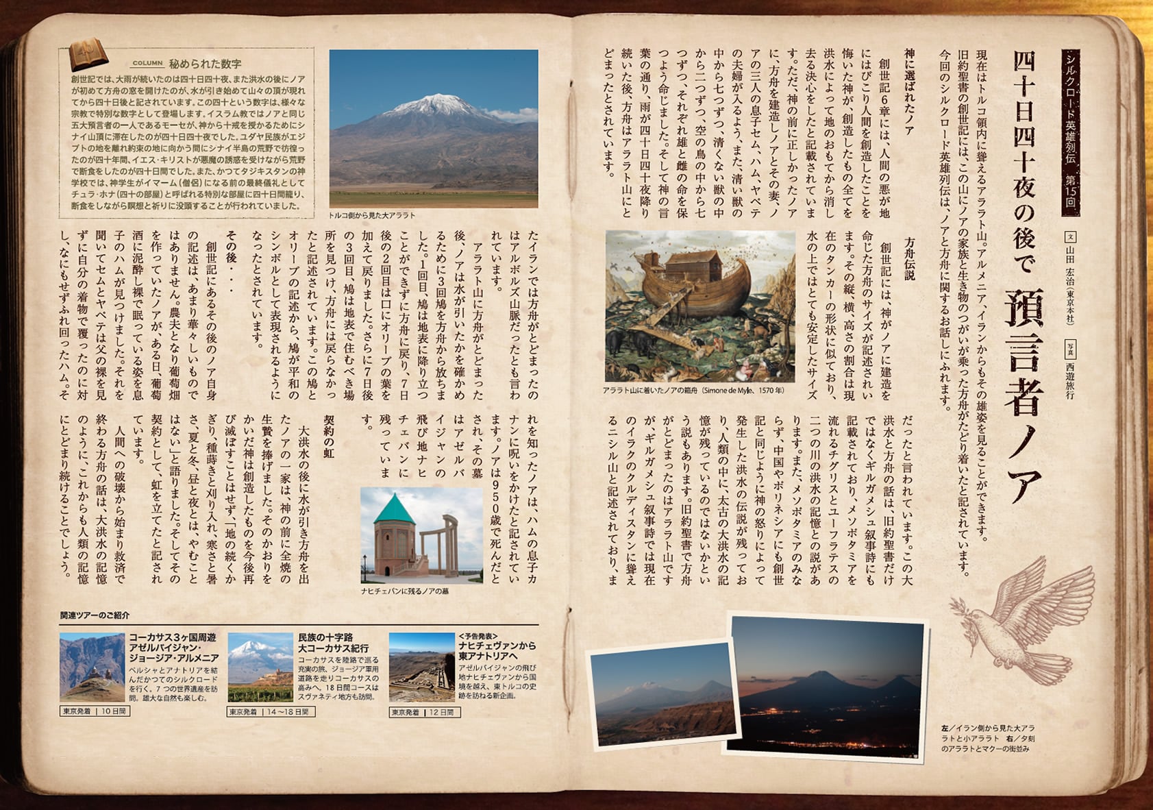 トルコ最高峰のアララト山。旧約聖書・創世記の記述では、悪に満ちた人類を洪水で滅ぼそうとした神は、神の前に正しかったノアに箱舟を造るよう命じました。ノアと3人の息子夫婦、全ての動物のつがいを乗せた方舟は、大洪水の中40日40夜漂った後、アララト山の山頂に流れ着いたとされています。