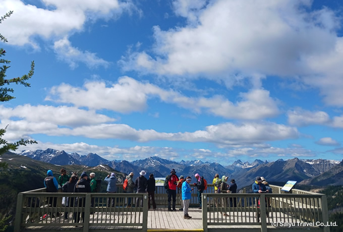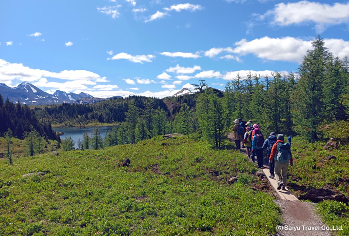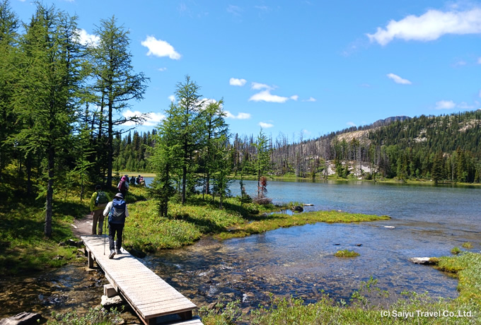 ゴンドラやリフトを利用し、スタート地点のスタンディッシュ展望台(2,275m)まで上がります。天気が良ければ、マウント・アシニボインなど360度パノラマの風景を楽しめます。その後、2つの湖を巡るループ・コースへ入り、色とりどりの高山植物の観察も楽しみます。