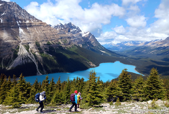 専用車にてアイスフィールド・パークウェイへ入り、ボウ・レイク湖畔の散策を楽しみます。その後、モミやトウヒなどの針葉樹が自生するトレイルに入り、ボウ・レイクを望むルックアウト(標高2,315m)までの往復ハイキングを楽しみます。ハイキング後、神秘的な色合いを見せるペイトー・レイク展望台もご案内します。