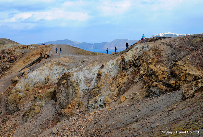 | 3 | サントリーニ島 | 午前、メサ・ヴーノ山へドライブし、島の高台にある古代ティラ遺跡を散策(約1.5時間)します。午後、半日火山クルーズ(混乗)に参加。島のカルデラの中央に位置する活火山島ネア・カメニ島に上陸し、火口付近までハイキングを楽しみます。また希望の方は湾内で、海底から湧き出る温泉での遊泳をお楽しみください。